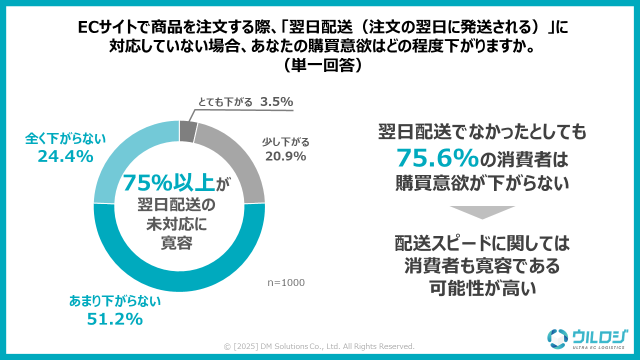 「翌日配送」に対応していない場合、購買意欲がどの程度下がるかという質問に対し、「全く下がらない」(24.4%)、「あまり下がらない」(51.2%)を合わせて、75.6%が「購買意欲は下がらない」と回答しました。