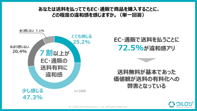 送料を払って商品を購入することへの違和感を尋ねたところ、「とても感じる」(25.2%)、「少し感じる」(47.3%)を合わせ、実に72.5%もの消費者が送料の有料化にネガティブな印象を持っていることが判明しました。