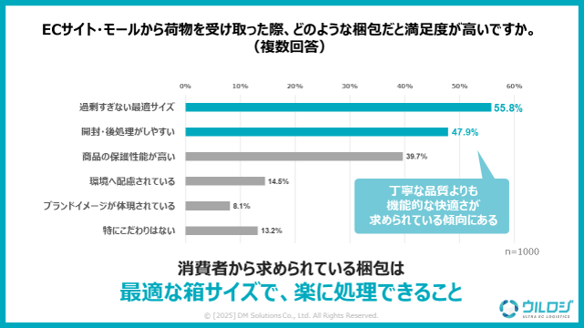 どのような梱包だと満足度が高いかという質問では、「過剰すぎない最適サイズ」が55.8%でトップ、次いで「開封・後処理がしやすい」が47.9%でした。一方で、「ブランドイメージが体現されている」は8.1%に留まりました。