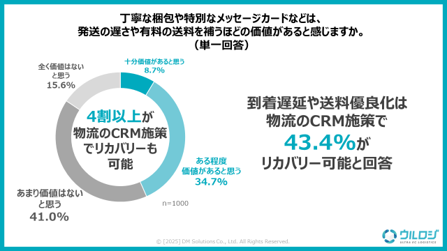 丁寧な梱包やメッセージカードが、発送の遅さや有料の送料を補うほどの価値があるかと尋ねたところ、「十分価値があると思う」(8.7%)、「ある程度価値があると思う」(34.7%)を合わせ、43.4%が価値を感じると回答しました。