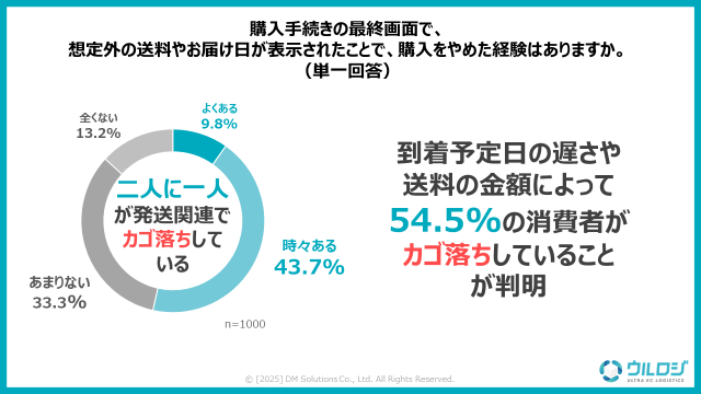 購入手続きの最終画面で、想定外の送料やお届け日が表示されたことで購入をやめた経験があるかという質問に対し、「よくある」(13.2%)、「時々ある」(43.7%)を合わせ、54.5%が「カゴ落ち」経験があることが分かりました。